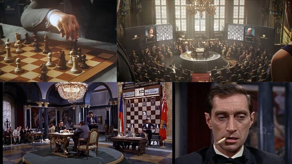 The imagery therefore connects directly to the location itself. The chessboard becomes a visual shorthand for the intellectual duel unfolding inside the hotel.