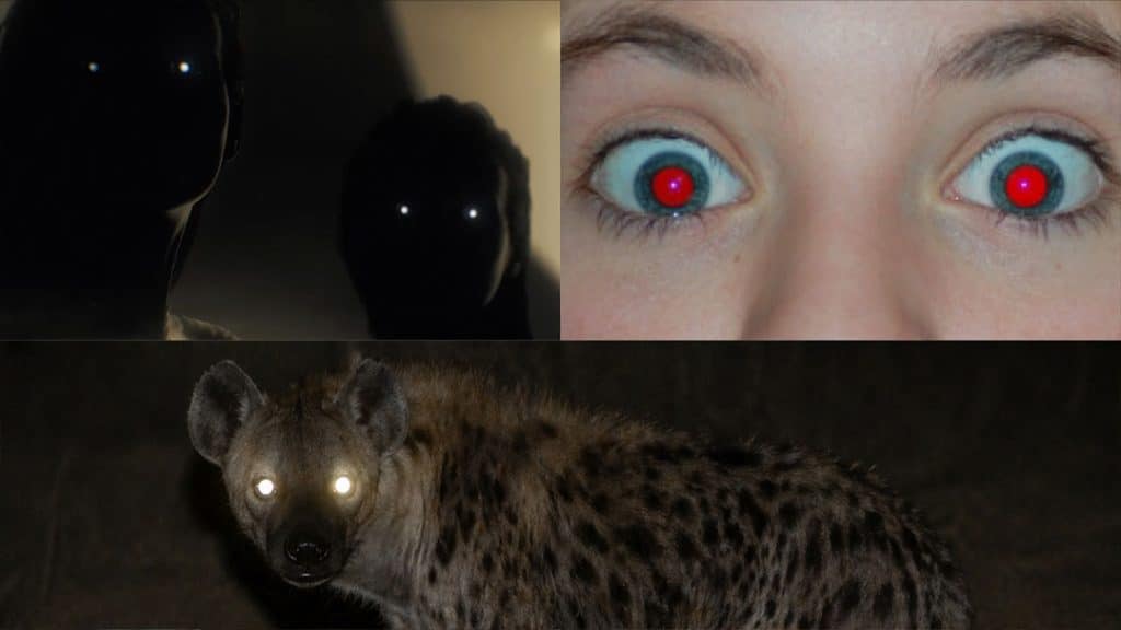 They glow with a stark white light, creating an effect that feels subtly unsettling. Human eyes can glow red in photographs when a flash reflects off the blood-rich retina at the back of the eye, producing the familiar red-eye effect.