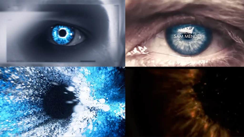 The transition into the next image is triggered by a tight zoom into Bond’s left eye — a visual move that clearly echoes Skyfall.