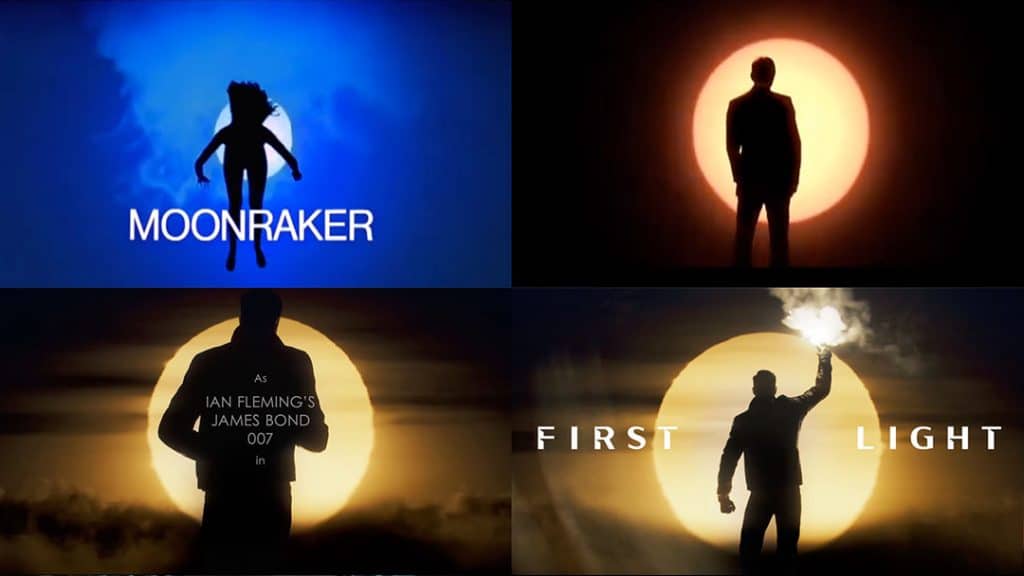 The next image may feel strangely familiar to longtime Bond fans. Bond stands in front of a large glowing disc, which recalls earlier title sequences that used celestial bodies as visual backdrops. In Quantum of Solace, Daniel Craig’s silhouette moves across the desert in front of a blazing sun, while Moonraker famously showed female silhouettes dancing and moving in front of the moon.